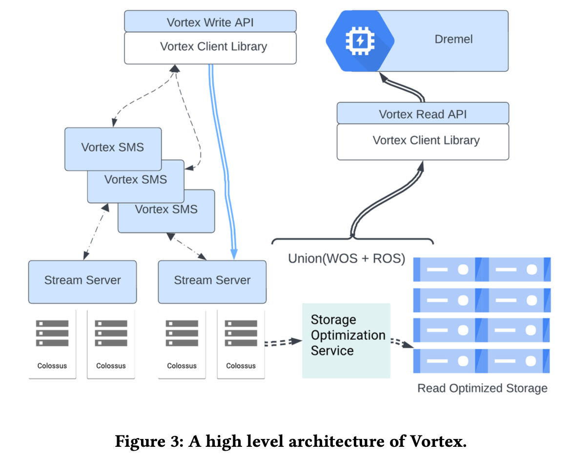 在 列存文件格式对比 一文中我们有描述 column file format 相关的内容,在 file format 之上会有存储引擎,Vortex[1] 是 BigQuery 中一个同时支持 streaming 和 batch 的存储系统,支持 sub-seconde 的 latency。