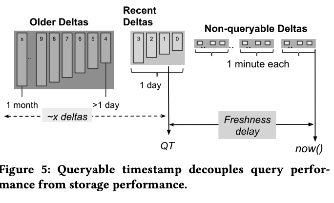 - 对小 IO 进行合并:Napa 使用 query 拆分并行查询,这可能会导致 tail letency 更严重,因此使用 QT(watermark) 来限制可查询增量的数量,另外还通过:1)跨 delta 的延迟合并以及基于磁盘大小的布局尽可能的合并小的 IO