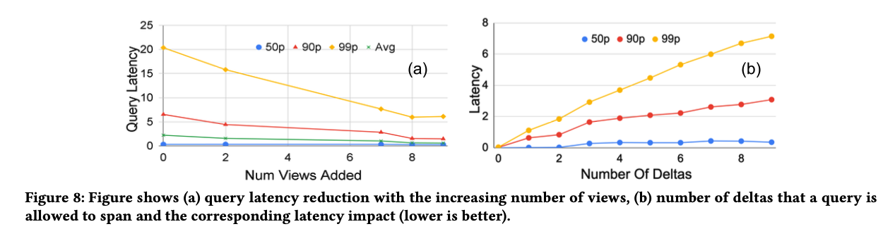 - 减少核心路径中的数据:Napa 会在 query 中尽一切可能使用 View 而不是 base table,因为 view 会比 base table 拥有更少的数据(且可能已经聚合过);会使用 delta 最底层(leaf node)的 btree 来进行 partition(后面续渐进式有讲),将原 query 拆分成多个小 query 并行化。不同数目的 view/delta 和查询性能的关系如下图所示
