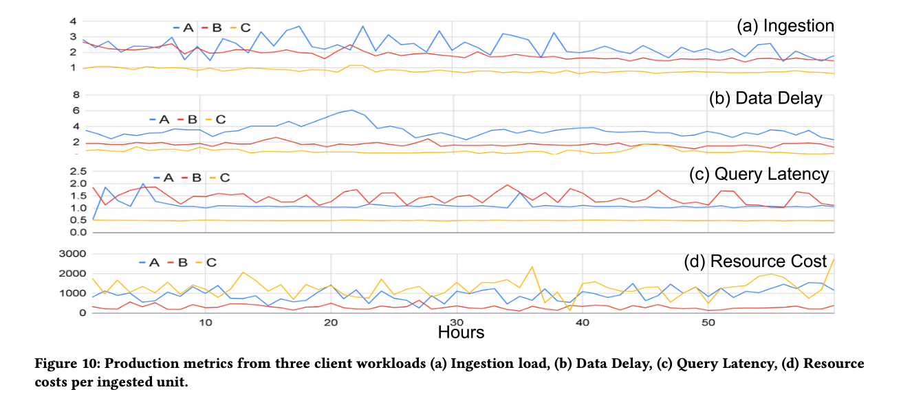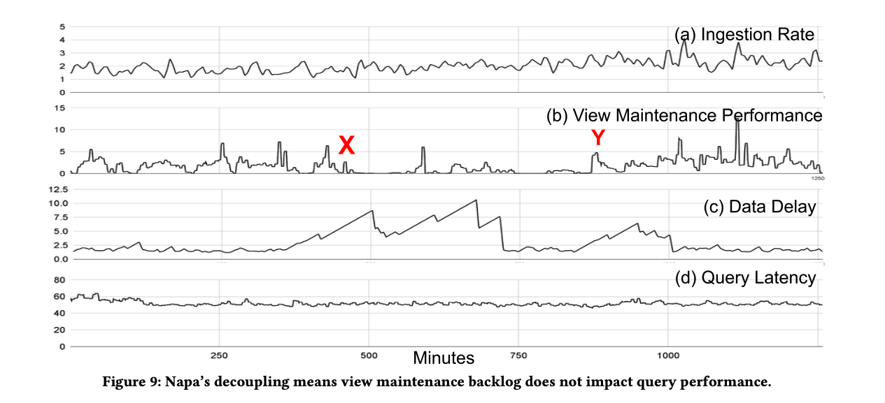Napa 将 ingest 和 view maintaince 拆开,可以很好的应对不同场景的 infra 问题,比如 ingest 速度变化很大,或者 view maintain 出问题,都不太影响 query performance,如下图所示,(a) 中的 ingest rate 有较大变化,但是性能基本没啥波动,(b) 中 X 和 Y 之间 view 的维护出问题,除了 freshness (c) 受影响,query performance 不受影响