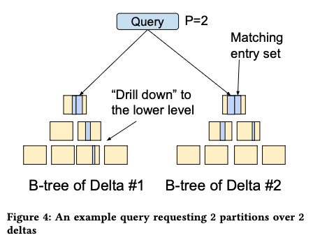 比如下图的 query 命中两个 delta,两个 delta 都有 drill down(访问非 root 层),第一个 delta 停在了最底层,第二个 delta 在第二层就停止了(满足了「足够好」的要求)
