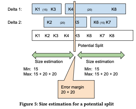 其中 cumulative size ($c_{i}$) 是 $(-\infty, k_{i}]$ 范围内所有符合条件的数据的估算量,在这里会维护一个 $c_{i}.min$ 和 $c_{i}.max$,其中 $c_{i}.min$ 是 [e.start, e.end] 中 key 前缀 p 满足 $p \in (k_i, k_{i+1}]$ 的最小值,然后 $c_{i}.max$ 则是这个范围内可能的最大值,比如在上图(Figure 5)中,可选的切分点如果在 K4 这里的话,那么最小的则是 [K1, K3], 最大的则是 [K1, K3,], [K2, K5] 以及 [K4, K8].