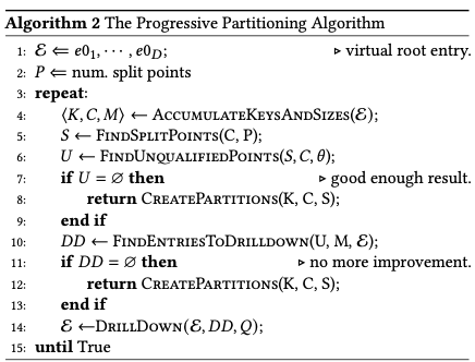 BTree 的 node 增加了层级统计信息,会在每个 subtree 中保存 key 的数目,这些数据逐层往上进行聚合。进行分区的输入是 queried keys,使用 B-Tree 的信息来生成近似的 histogram,从 root 开始进行 partition,最终停在 partition 「足够好」的 level。