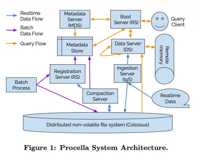 - Procella 使用了轻量级的 zonemaps, bloom filters, partition 以及 sort key 等二级索引,而不是 BTree,二级索引从文件头、或者 plan 的时候从 data server 获取,schema、table->file mapping, stats 以及 zonemap 这些存储在 BigTable/Spanner 中