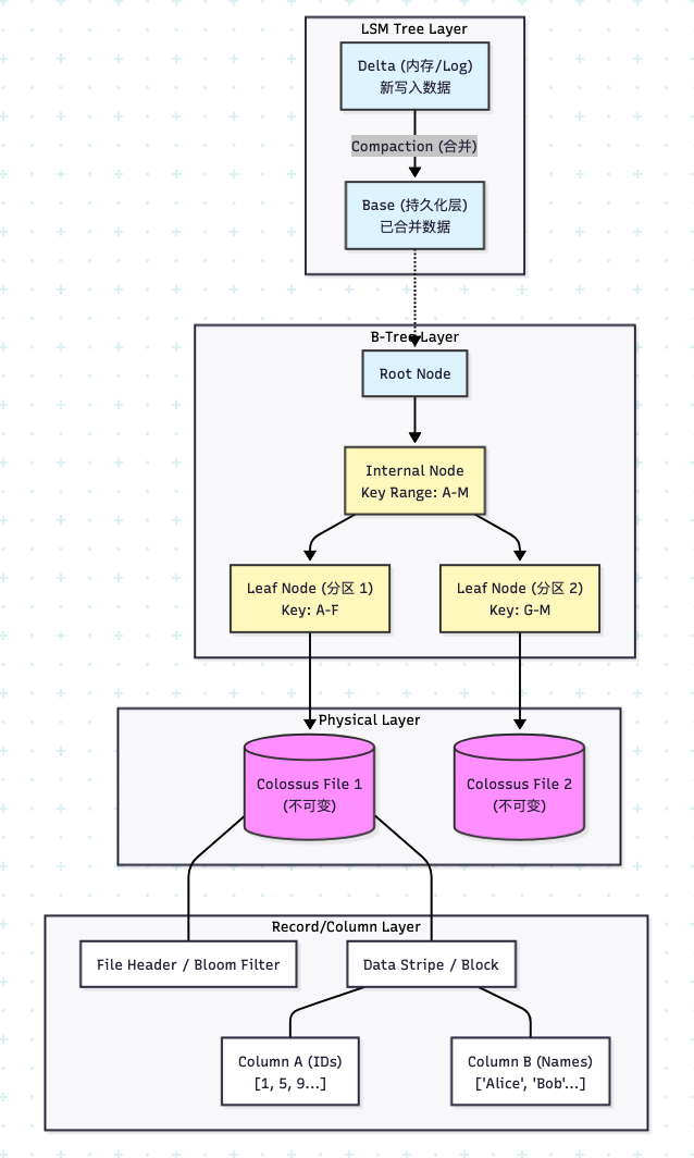 Log file 是具体的物理文件,这些文件在 Vortex 中有两种:WOS(写友好)和 ROS(读友好),分别用于不同的场景(BigQuery 的 ROS 是 Capacitor,BigLake 的则是 Parquet)。